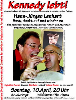 Der Autor Hans-Jürgen Lenhart nimmt die mysteriösen Umstände um den Kennedy-Mord auf und spinnt sie weiter. Dabei entsteht ein absurdes Paralleluniversum des Leben Kennedys, in dem viele Hintergründe um das Ereignis und den Kennedy-Clan ans Licht kommen. Lenhart bietet keine neuen Verschwörungstheorien zum Kennedy-Mord im Jahre 1963, sondern spielt mit ihnen und nimmt sie zum Ausgangspunkt von fantastischen Geschichten. Und nicht nur das. Diese Lesung sprengt den üblichen Rahmen: Sie zeigt "Beweisstücke", beleuchtet Hintergründe, bezieht die Zuhörer mit ein. Begleitet wird Lenhart dabei vom Perkussionisten Jürgen Weiß, der mit diversen akustischen Gerätschaften zusätzliche Akzente setzt und als Musiker und Ko-Vorleser für hörspielartige Atmosphäre sorgt.
